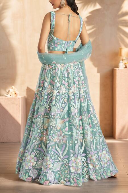 Buy_Samyukta Singhania_Blue Net, Linen Sequins, Zari, Applique Floral Embroidered Lehenga Set_at_Aza_Fashions
