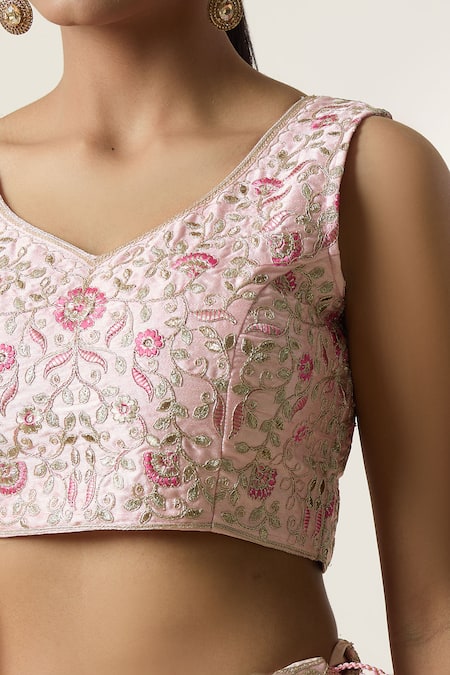 Peach Silk, Net Embroidery V-neck Floral Thread Lehenga Blouse Set