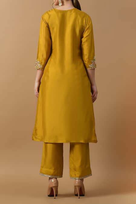 Buy_Samyukta Singhania_Yellow Silk, Organza Embroidery, Lace Floral Thread Straight Kurta And Pant Set _at_Aza_Fashions