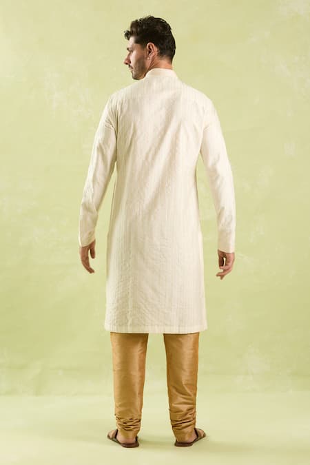 Cream kurta featuring floral vine embroidery with thread work and a mandarin collar. Paired with a contrast gold churidar made from art silk.
