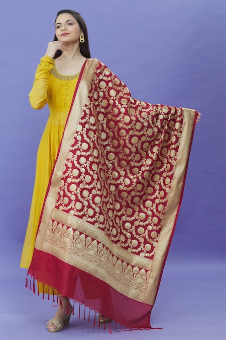 Buy_Naintara Bajaj_Maroon Brocade Zari, Fringe Banarasi Art Silk Floral Woven Dupatta_Online_at_Aza_Fashions