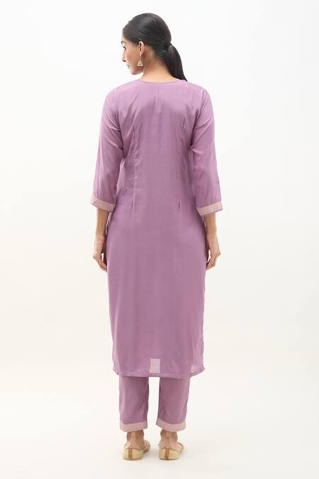 Purple Muslin, Satin Embroidery Round Neck Floret Butti Pattern Kurta Pant Set
