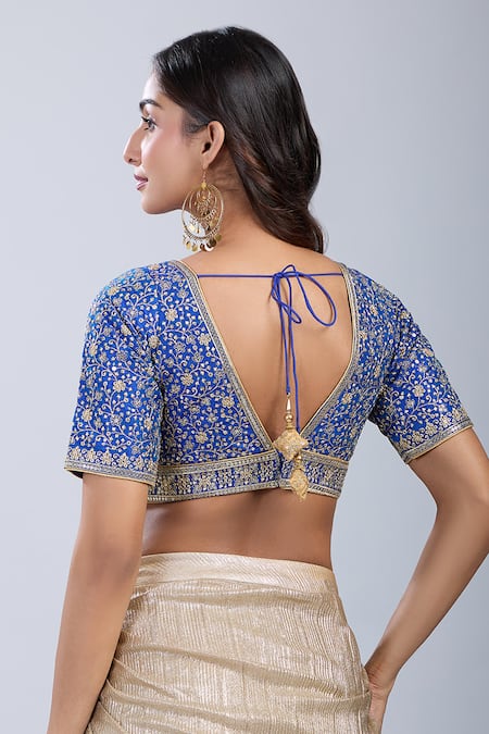 Royal blue blouse in raw silk featuring floret embroidery and padding.