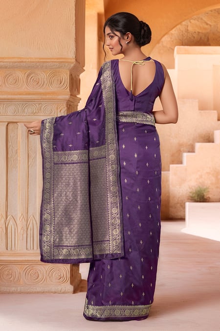 A purple Banarasi silk saree featuring woven floret motifs and a broad golden zari border. It is paired with a matching purple sleeveless blouse with a boat neck and a deep U-back with tie-up detail.