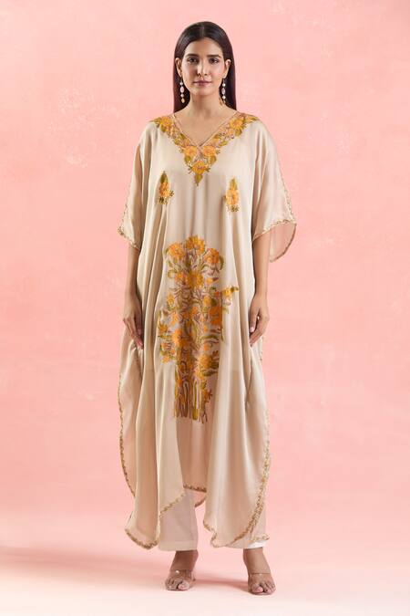 Cream kaftan featuring yellow resham embroidery in floral pattern and V neckline