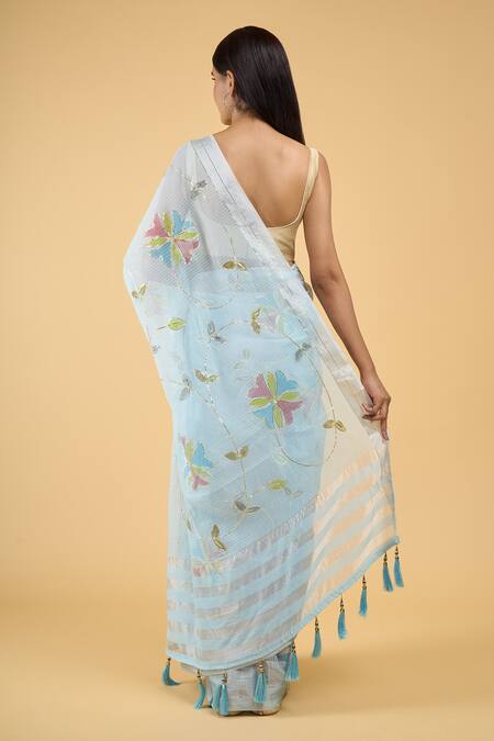Blue saree featuring hand-painted flower motifs and gota patti embellishments. Comes with a running blouse and a tassel border.