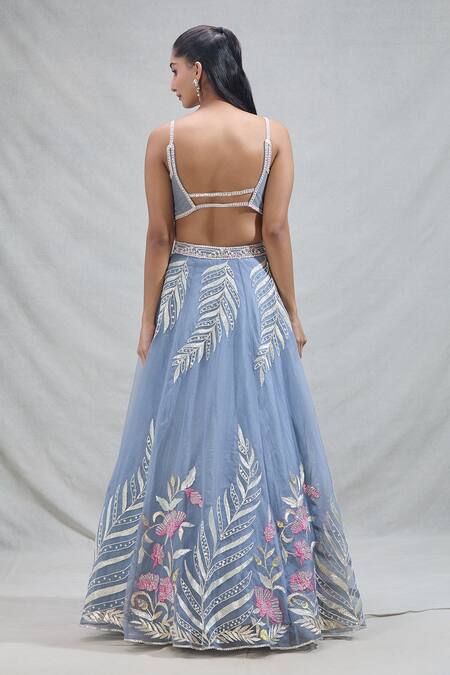 Grey Net Beads, Sequins, Embroidery Sweetheart Neck Flower Vine Lehenga Set
