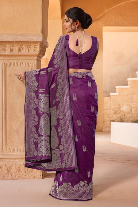 A purple Banarasi silk saree featuring intricate flower woven patterns and a detailed border. It is paired with a matching sleeveless blouse with a V-neckline and back tie-up closure.