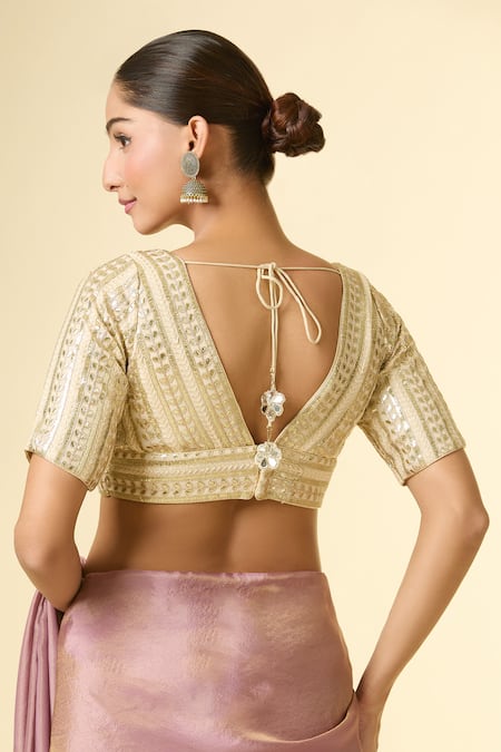 Gold geometric embroidered blouse featuring a deep V-neckline and short sleeves