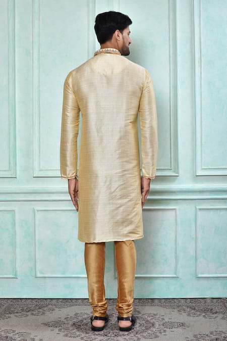Cream kurta featuring geometric embroidered placket and mandarin collar. Paired with a chickoo churidar in art silk fabric.