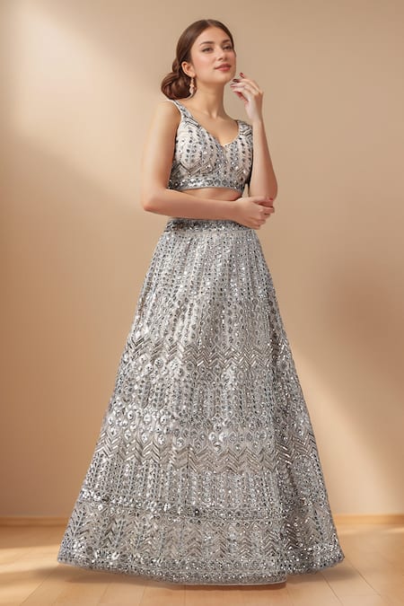 Beige Net, Linen Sequins, Mirrors, Stones, Zari, Geometric Lehenga Set