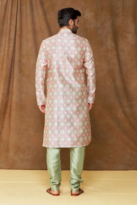 Cream kurta featuring geometric patterns and a mandarin collar. Paired with a green churidar in Art Banarasi silk.