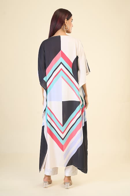 Beige Georgette Boat Neck Geometric Print Asymmetric Straight Kaftan