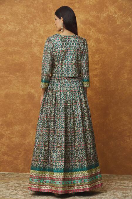 Multi color floral printed lehenga set featuring a cropped open jacket. Paired with a matching padded blouse and a drawstring lehenga skirt with a length of 42 inches.