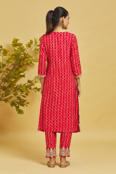 Red straight kurta featuring an all-over geometric print and floral zari embroidered yoke & hemline. Paired with geometric print pant and scallop trim dupatta with zari embroidery.