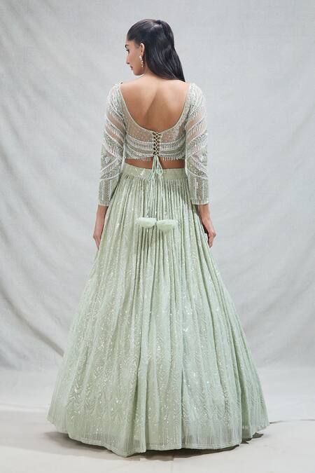 Pista green lehenga featuring all-over geometric sequin embroidery. Paired with a padded blouse adorned with sequins, beads, and a choker dupatta.