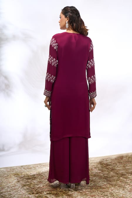 A magenta georgette kurta features geometric hand embroidery and a V-neckline, with full sleeves and a front slit. It is paired with coordinating magenta georgette wide-leg pants and a matching dupatta.