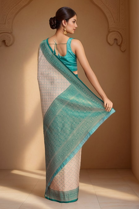 Buy_Naintara Bajaj_Green Kota Doria Fringe, Embroidery V-neck Geometric Woven Kanjivaram Saree Set