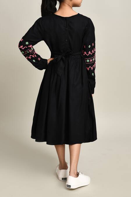 Black Cotton Embroidery Girls Fit And Flare Dress
