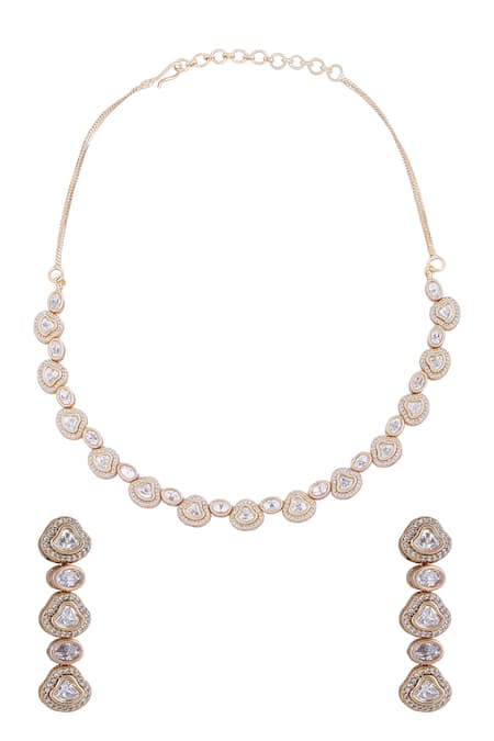 Intricate gold detailing on the necklace, White stone embellishments in various shapes, Chain closure for adjustable fit