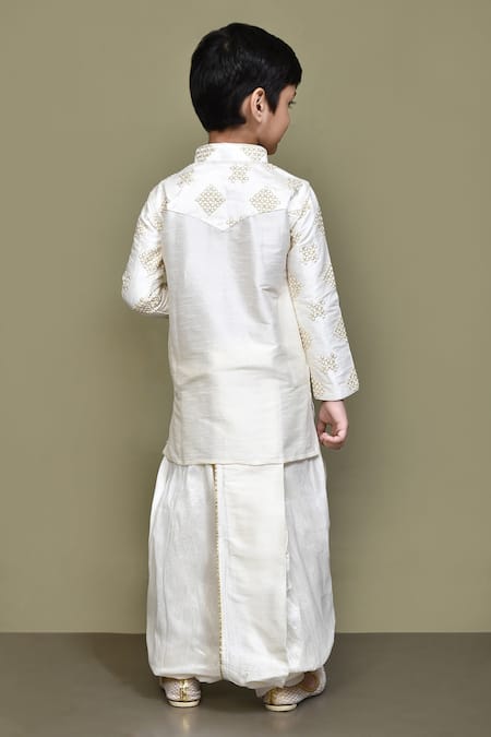 White kurta featuring gota and thread embroidery with a side slit design. Paired with an elasticated waistband dhoti pant made from art silk.