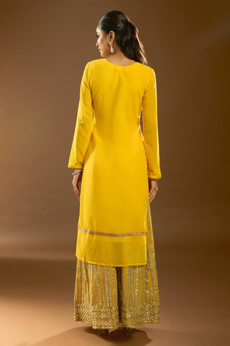 Yellow Chiffon, Silk Sequins, Gota Patti Collared Striped Kurta Palazzo Set