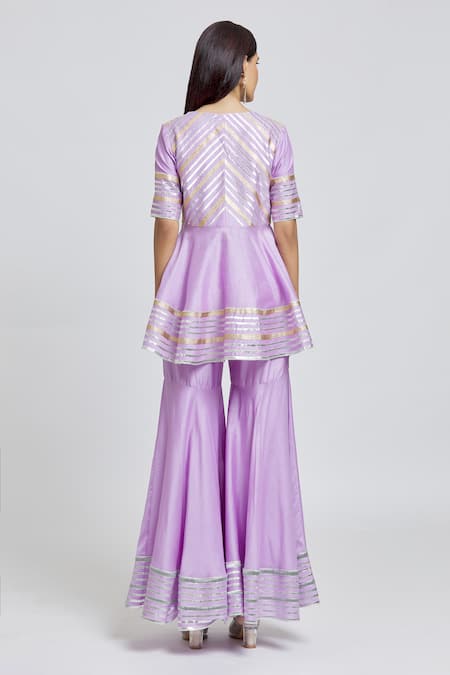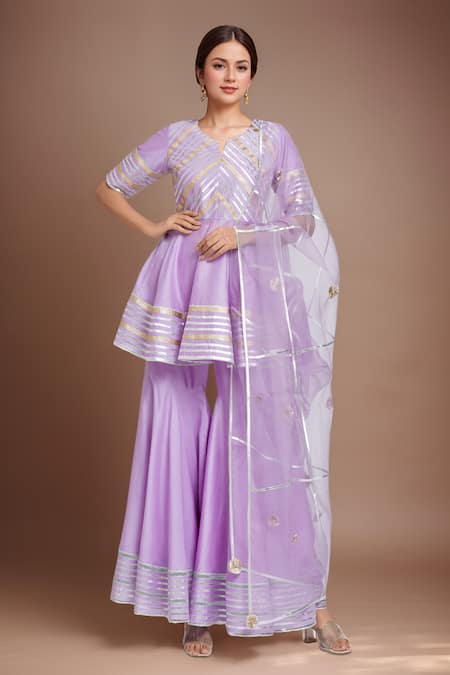 Purple peplum kurta featuring gota striped embroidery and a round V neckline. Paired with a matching gharara and an organza dupatta.