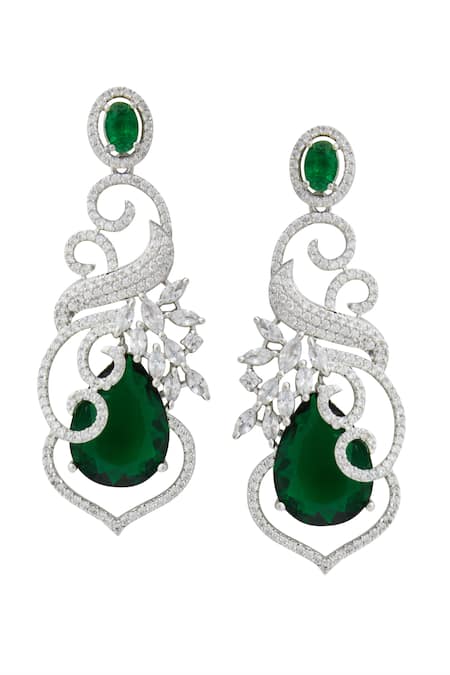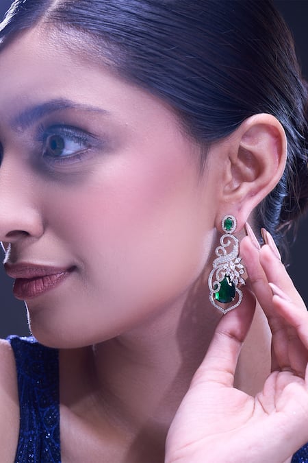 Green earrings featuring brass composition with American diamond embellishments