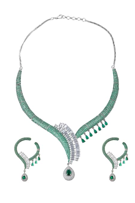Green necklace featuring American diamond embellishments and a hook closure. Paired with matching earrings featuring pushback closure.