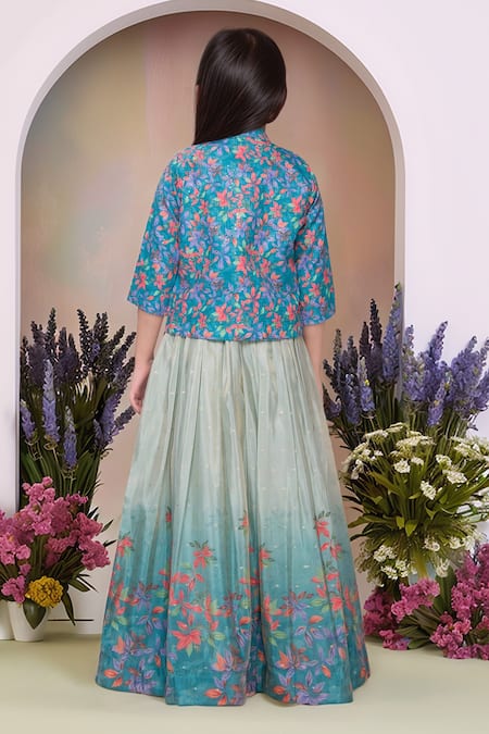 Mirror work detailing on bodice, Floral gradient print on skirt, Lightweight satin fabric