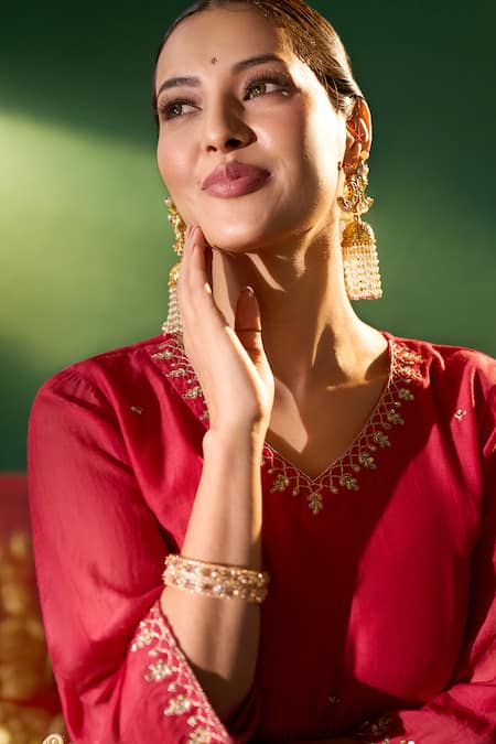 A cherry red Mul Chanderi kurta featuring hand embroidery details on the V-neckline and sleeve cuffs, with a flared silhouette and lining. Paired with coordinating pants that have an elastic waistband and a matching dupatta.