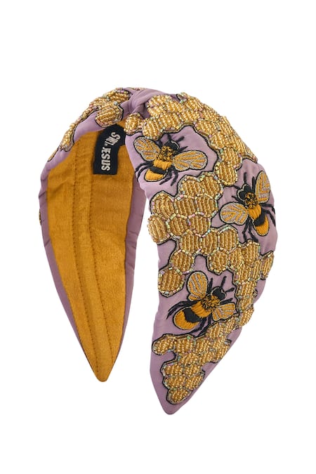 Dark purple hairband featuring hand embroidery with honey and bee designs
