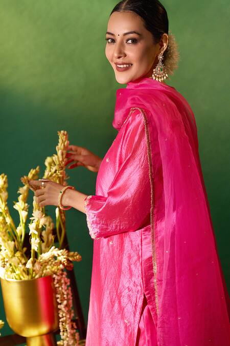 Pink Silk Embroidery, Sequins Split V-neck Hand Kora Kurta Set
