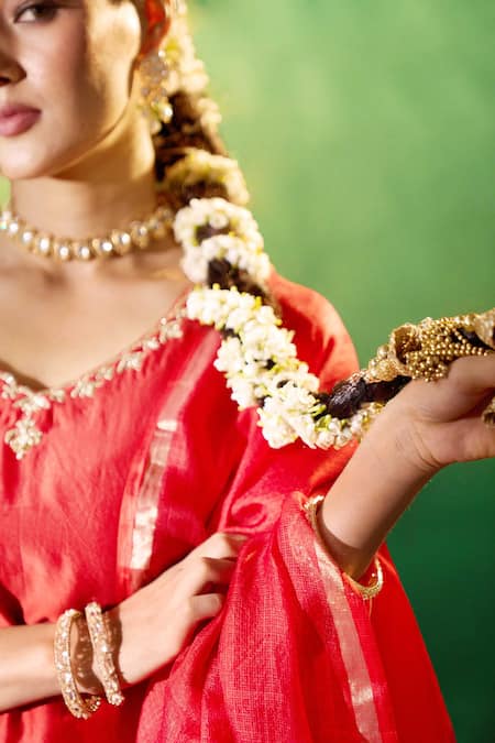 A red Chanderi Silk kurta featuring hand embroidery details and a lining. It is paired with coordinating pants with an elastic waistband and a matching dupatta.