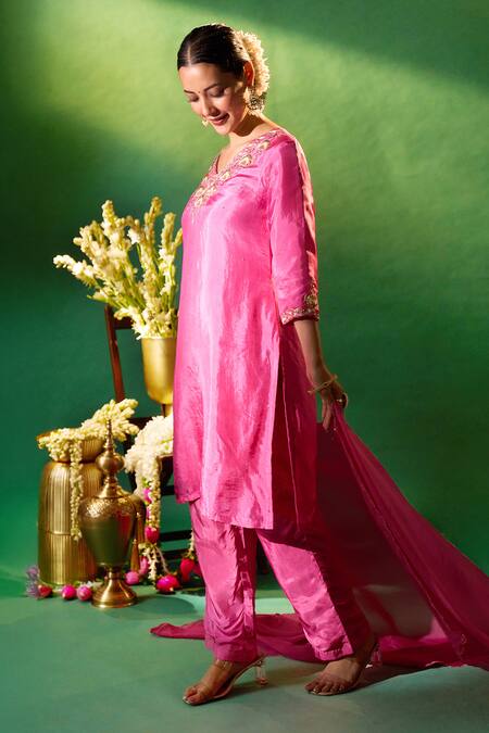 A hot pink silk kurta featuring hand embroidery on the V-neckline and sleeve cuffs. It is paired with coordinating hot pink pants with an elastic waistband and a hot pink dupatta.