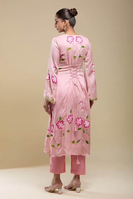 Pink Satin Embroidery V-neck Hand Painted Kurta Set