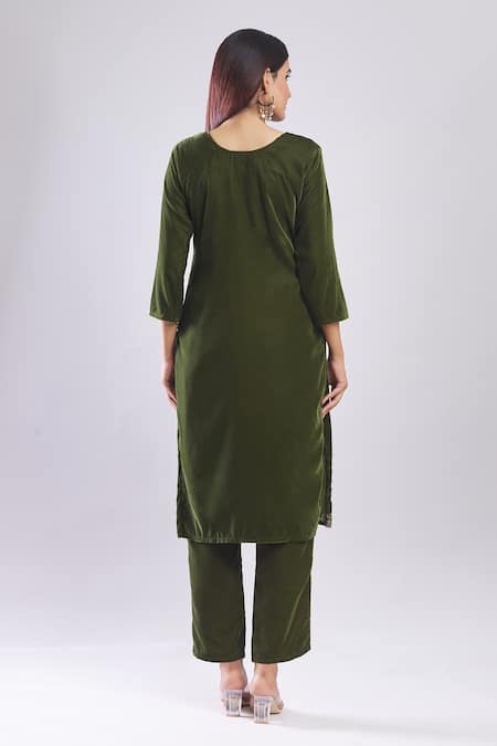 Grass green heavy velvet kurta featuring intricate embroidery on the front and hem. Paired with matching pants and a dupatta with scalloped edges.