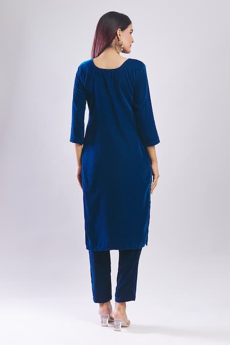 Blue Velvet Embroidery Round Neck Heavy Kurta Set