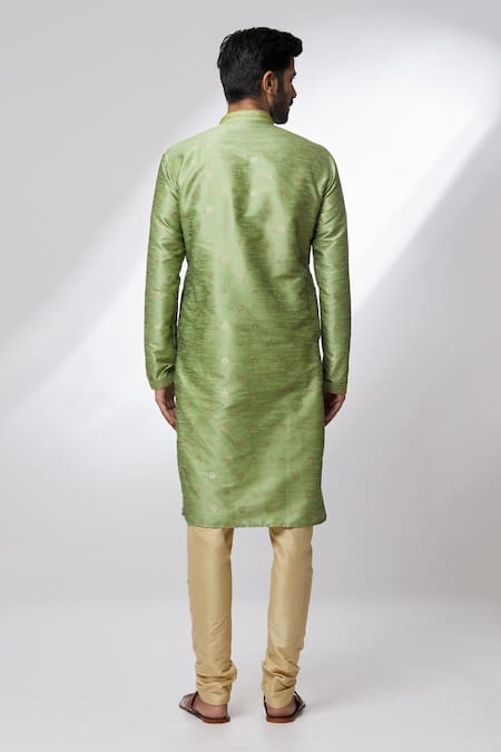 Green kurta made of jacquard banarasi silk featuring a woven floral butti pattern and resham embroidered mandarin collar