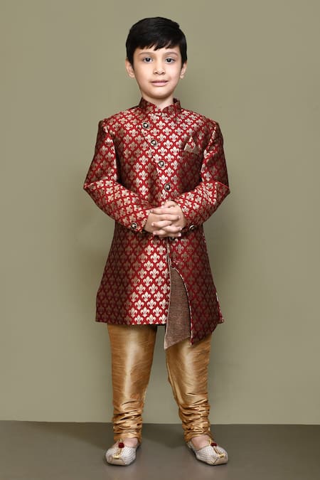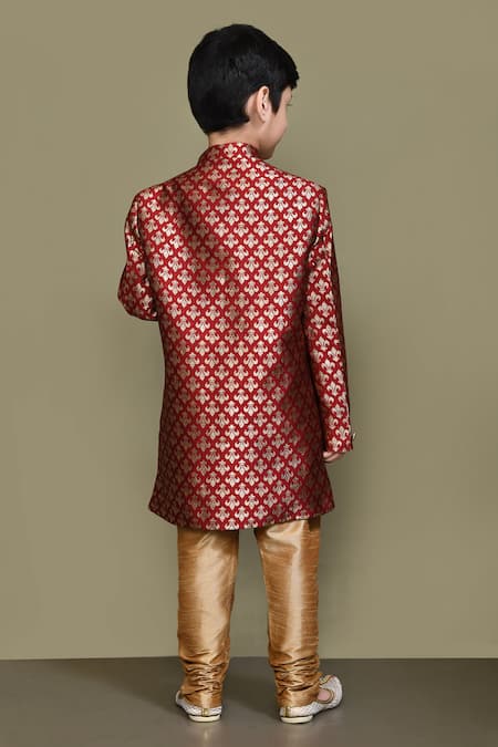 Buy_Petite Pomme_Maroon Jacquard, Chanderi Embroidery Long Sleeve Sherwani And Churidar Set _at_Aza_Fashions