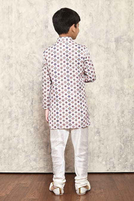 Cream kurta featuring a mandarin collar, full sleeves, and jewel motif print with striped thread work and sequins. Paired with a cream churidar for a complete look.