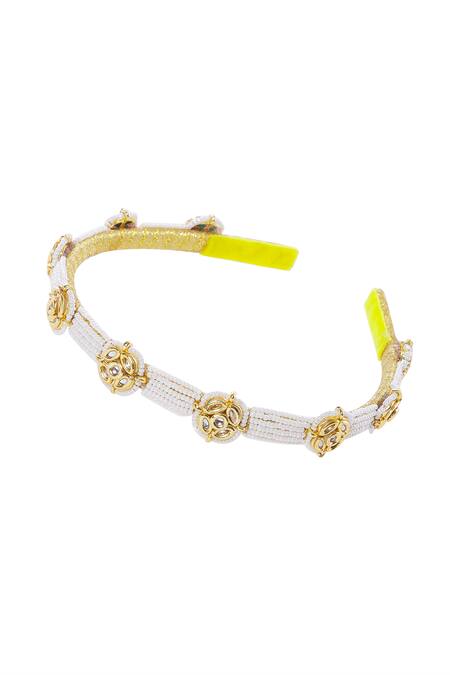 Kundan and pearl hair band featuring an alloy base and floral embellishments