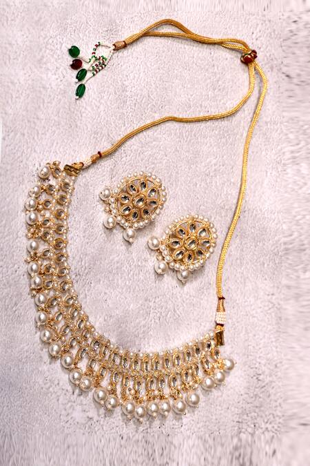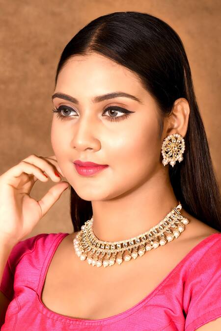 Gold toned choker necklace studded with jadau kundans, stones & pearls. Comes with stud earrings in round shape.