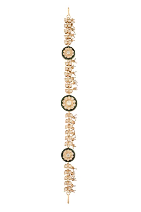 Green brass mathapatti featuring Kundan work with floral motifs and hanging embellishments