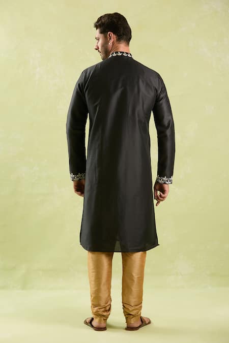 Black kurta featuring leaf thread embroidery in scallop pattern. Paired with a contrast gold solid churidar.