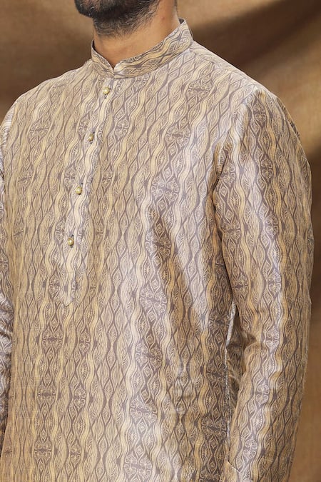 Cream kurta featuring a leaf print with a mandarin collar and full sleeves. Paired with a churidar made of Art Banarasi Silk.