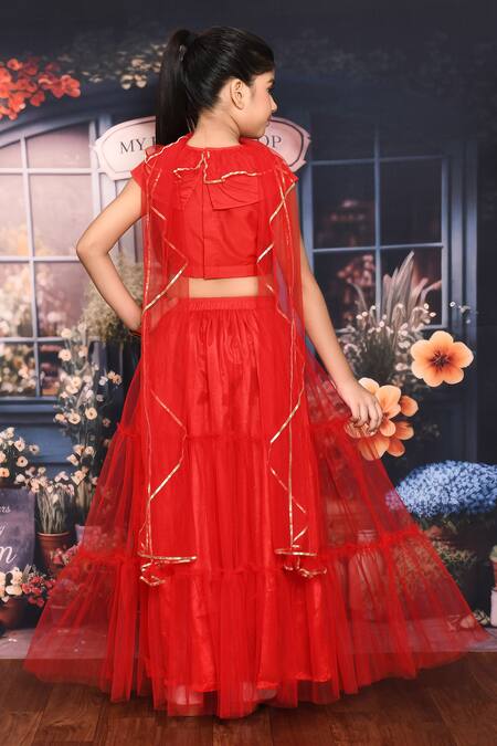 Buy_Petite Pomme_Red Net, Cotton, Silk Zari Lehenga And Ruffled Blouse Set_Online_at_Aza_Fashions