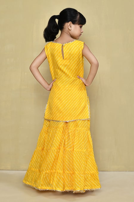 Yellow kurta featuring leheriya patterns and gota lace trim. Paired with a tiered gharara with an elasticated waist.