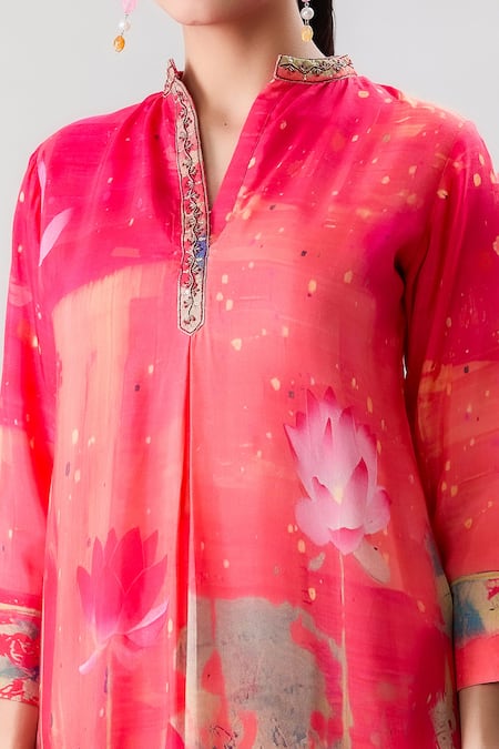 Orange Muslin Embroidery, Beads Mandarin Collar Lotus Pond Print Kurta With Pant