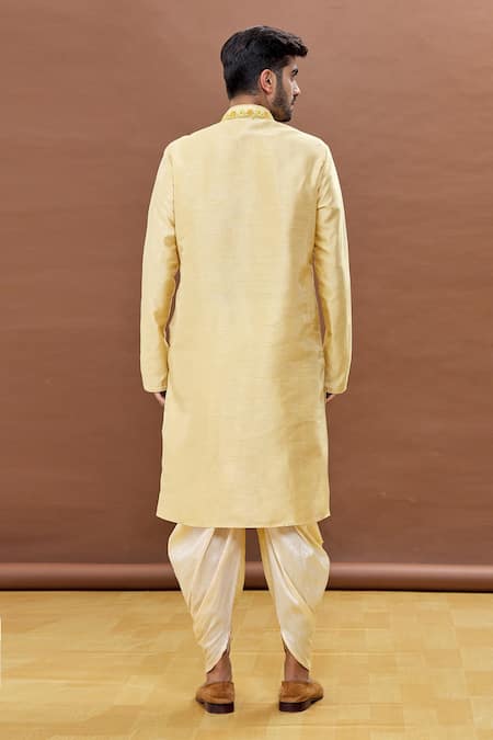 Gold kurta featuring a mandarin collar and floral embroidered placket. Paired with cream silk patiala with an elasticated waistband and drawstring tie-up.